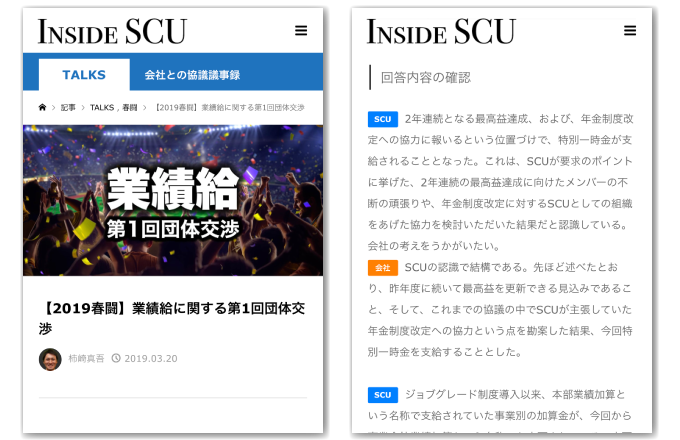 会社との協議は、労働組合としてもっとも基本的な役割のひとつです。その成果物である協議議事録は、会社とSCUの公式な協議の議事録であり、その内容を見れば、ソニーの制度の変遷や組織の移り変わりまでわかるのです。SCU は、協議内容をウェブサイトにてタイムリーにお届けしています。